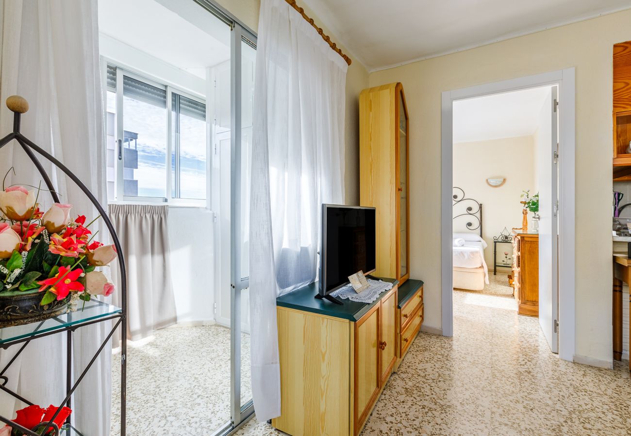 Located in a building with an elevator, this seventh-floor apartment offers stunning views of the Mediterranean Sea. Upon entering, you'll be greeted by a cozy hall that leads you to a charming bedroom with a 135 cm double bed and a full bathroom with a shower. The separate kitchen, open to the bright living-dining room with air conditioning, provides you with a comfortable and functional space to prepare your favorite meals. From the living room, you can access the private terrace with panoramic views of the sea and the promenade, where you can relax and enjoy the sea breeze.