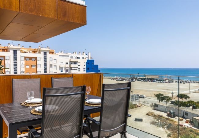Die Wohnung ist aufgeteilt in zwei Schlafzimmer, zwei Badezimmer, ein Wohn-Esszimmer, eine Terrasse mit spektakulärem Blick auf das Meer und eine Küche.
